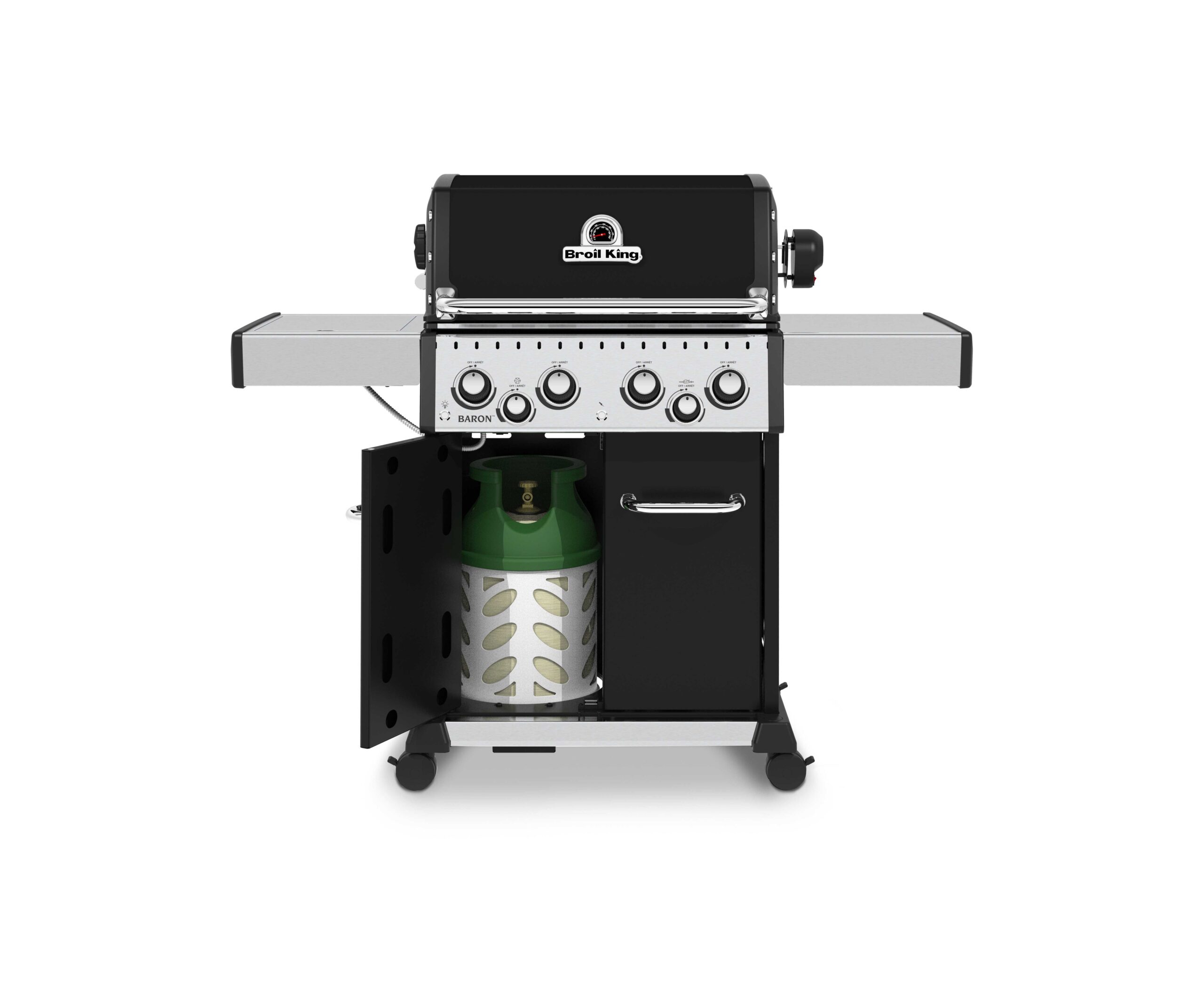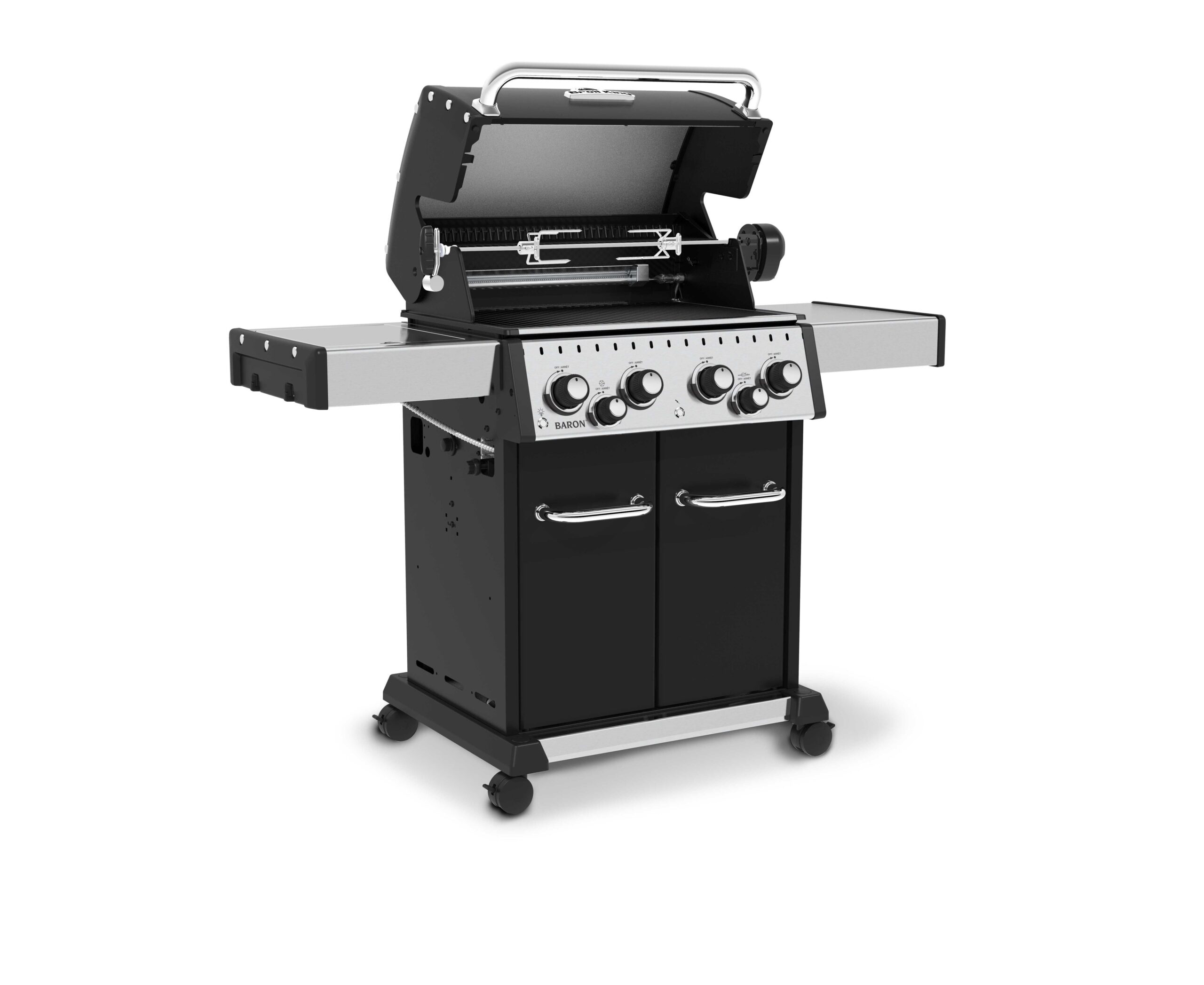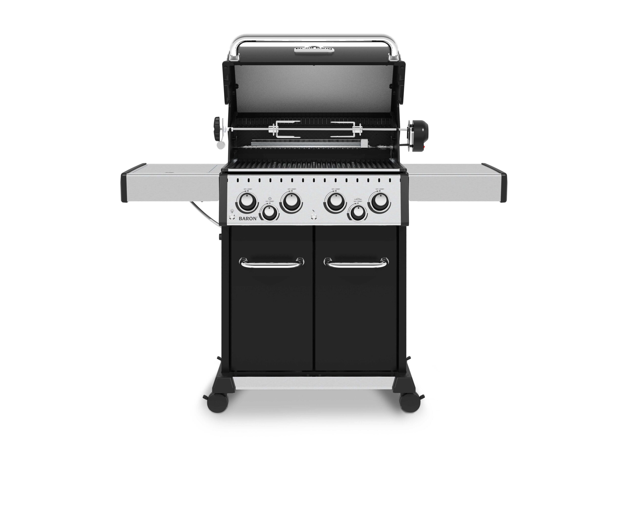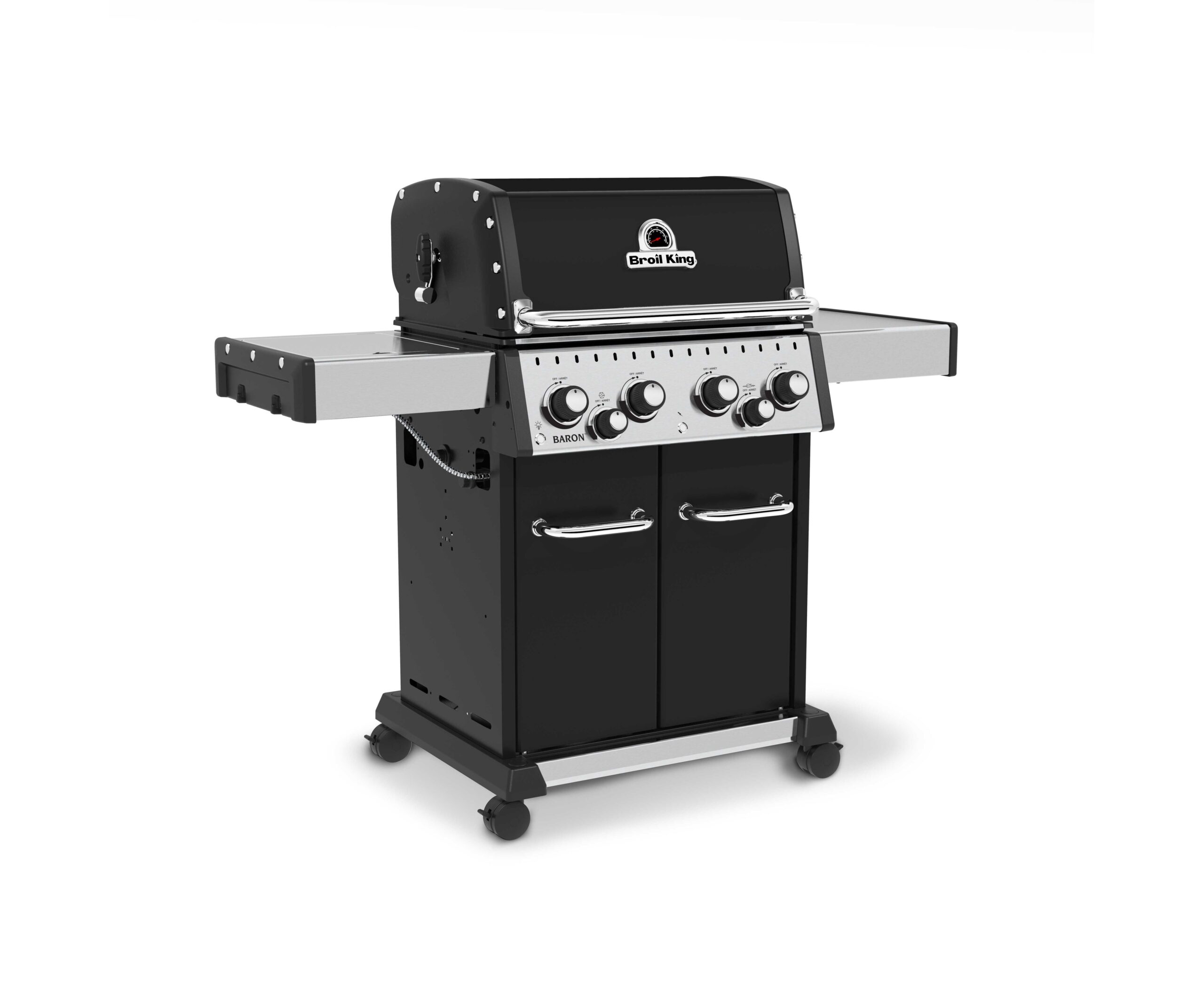 Газовий гриль Broil King Baron 490представник самої популярної лінійки від виробника Broil King. Гриль оснащений однією місткою камерою на 4 пальники і  двосторонніми чавунними решітками. Також у гриль входить рожен на 2 виделки і горизонтальний пальник і закрита шафа з двома дверцятами для зберігання аксесуарів та інструментів. У грилі є бічна конфорка, що дозволяє готувати та підігрівати соус для Вашого барбекю. А підсвічування регуляторів не тільки допоможе при процесі в темний час доби, але також стане окрасою вечора.На гриль надається гарантія 24 місяці.
