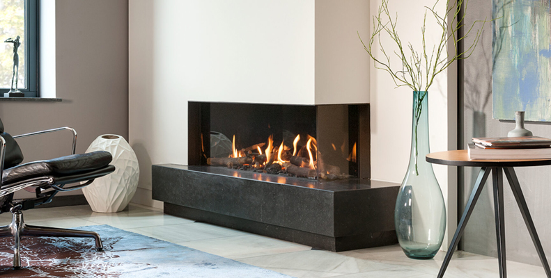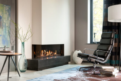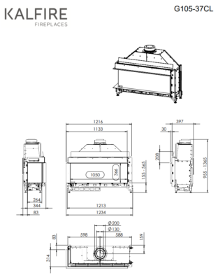 Kalfire Kalfire G105 / 37C L / R –  це камін з кутовим склом, ширина фронтального 105 см, ширина бічного 26,8 см, а висота 36,6 см. Є можливість замовити як правобічний камін, так і лівобічний.