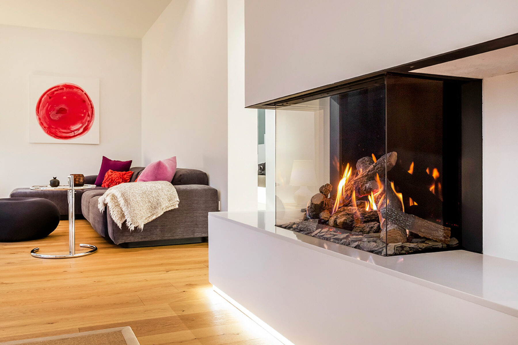 Пальники вбудовані по всій довжині каміна в керамічні поліна, які встановлені в топці у вигляді куреня. Зовні це виглядає немов вогонь виходить безпосередньо з полін. Для ще більш реалістичного полум’я ви можете включити світлодіодне підсвічування в підставі каміна, яка імітує тління дров. Завдяки цій функції камін можна використовувати і в теплу пору року, коли не потрібно обігрів приміщення.