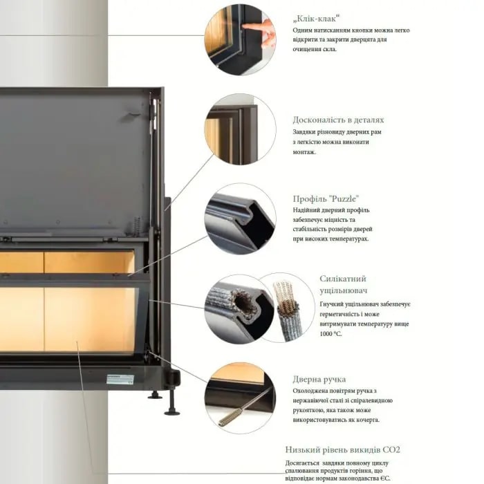 | • Масивна релінгова дверна ручка виготовлена з високоякісної нержавіючої сталі і розташована в центральній частині дверей. Залишається прохолодною в процесі роботи каміну. • Тугоплавка склокераміка Schott ROBAX найвищого гатунку. |