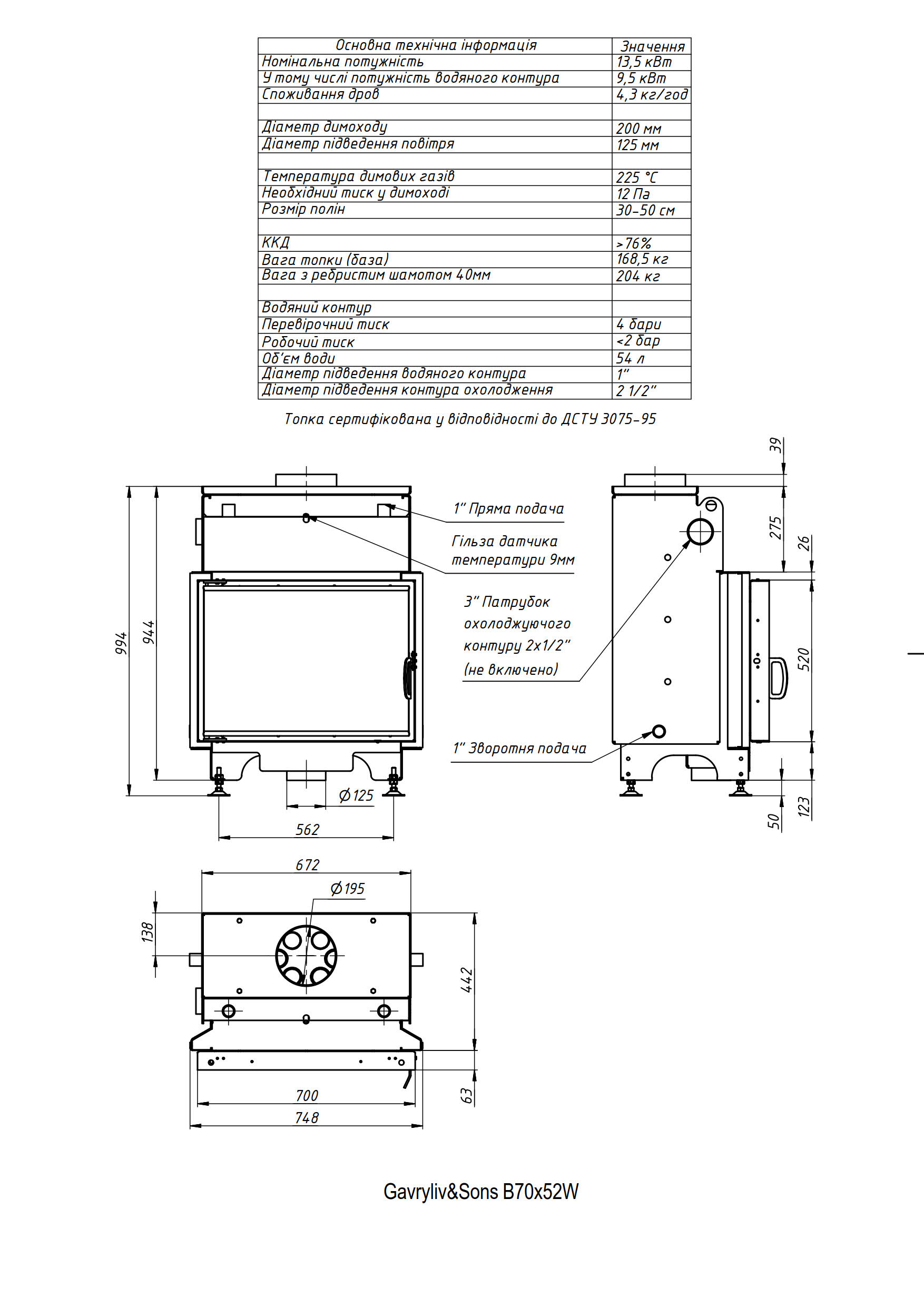 Водяна камінна топка Gavryliv&Sons 70×52 маютє просту та надійну конструкцію.