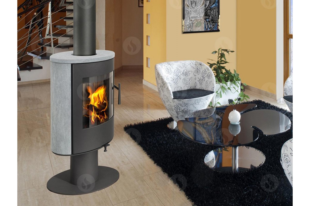 Стальна піч чеського виробника Romotop EVORA T 02 на ніжці, з можливістю обертання камери горіння навколо своєї осі на 360 градусів. Піч Romotop має сучасний та стильний  дизайн, тому чудово впишеться у будь-який інтер’єр Вашого будинку. Естетичного вигляду печі надають верхня і бокові накладки з каменю стеатит. Піч – камін Romotop Evora T 02 доповнена жаростійким панорамним склом, що робить її надзвичайно стильною та елегантною. Завдяки вторинній подачі повітря скло дверей омивається потоком повітря, що запобігає накопиченню кіптяви.